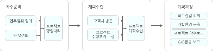 - 착수준비 : 프로젝트 행정처리, 업무범위 정의, 개발환경 구축, SPM정의
