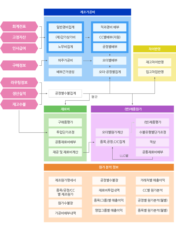 - 발생된 품목의 수불 정보를 통해 실제 BOM정보를 구성, 회계관리에서 발생된 전표정보를 통해 가공비를 집계
