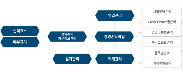- 기업의 관리기준에 따른 손익요소 및 배부규칙관리 기능을 제공합니다.