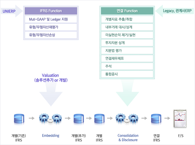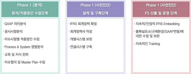 총 3단계로 이루어진 IFRS도입 프로젝트가 구성되며, Phase 1에서는 이슈파악과 향후 설계구축을 위한 Master Plan 수립이 전제되어야 하며, 고객사 내부적으로 Phase 1단계를 수행하여 요건 정의한 후 UNIERP에서 Phase 2단계를 수행함