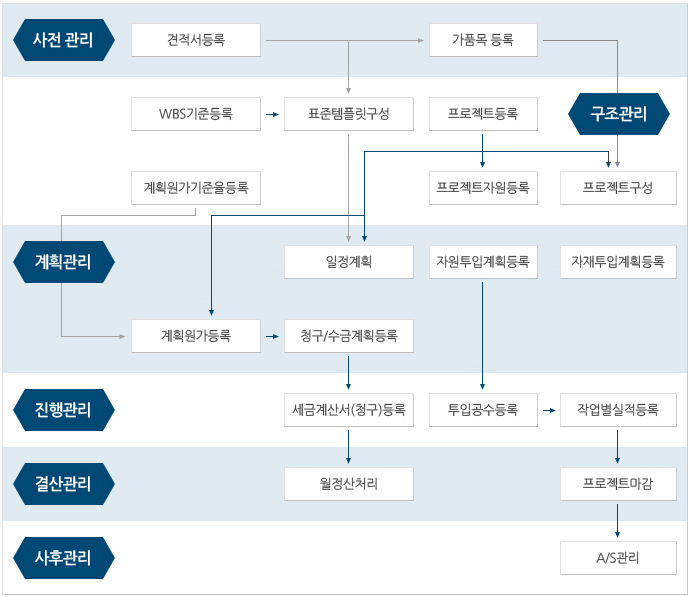 - 프로젝트별 매출인식기준 적용과 함께 프로젝트별 원가 계산과 손익정보를 제공합니다.