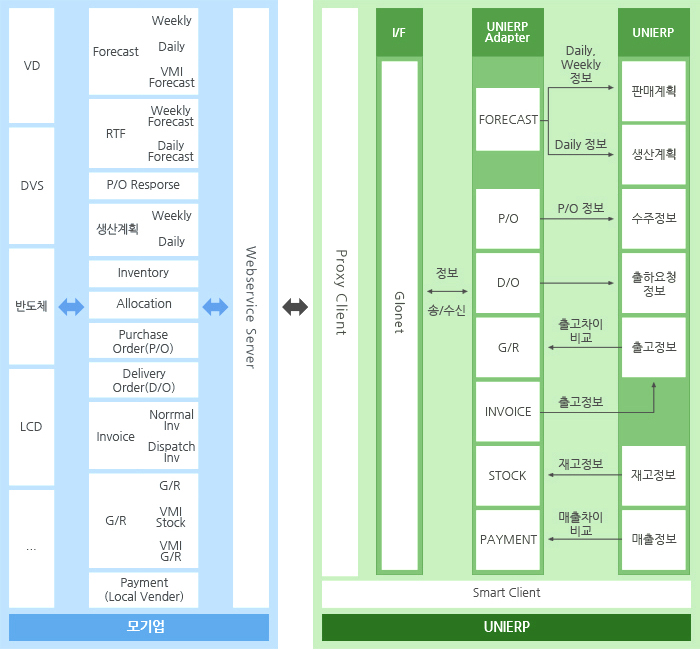 - 모기업의 Forecast, P/O, D/O등의 정보를 ERP와 연계하여 시스템을 통한 송/수신을 통하여 모기업의 변화에 빠른 대처가 가능합니다.