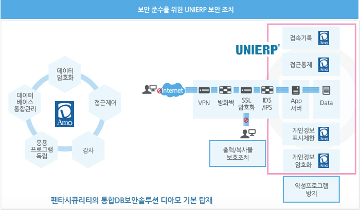 UNIERP 통합 보안솔루션(D’amo)은 정보 보호에 관한 관련 법규 준수를 위해 개인정보 데이터에 대한 사업자 준수 조치와 안전조치의 이행 등 완벽한 보안 기능을 지원합니다.