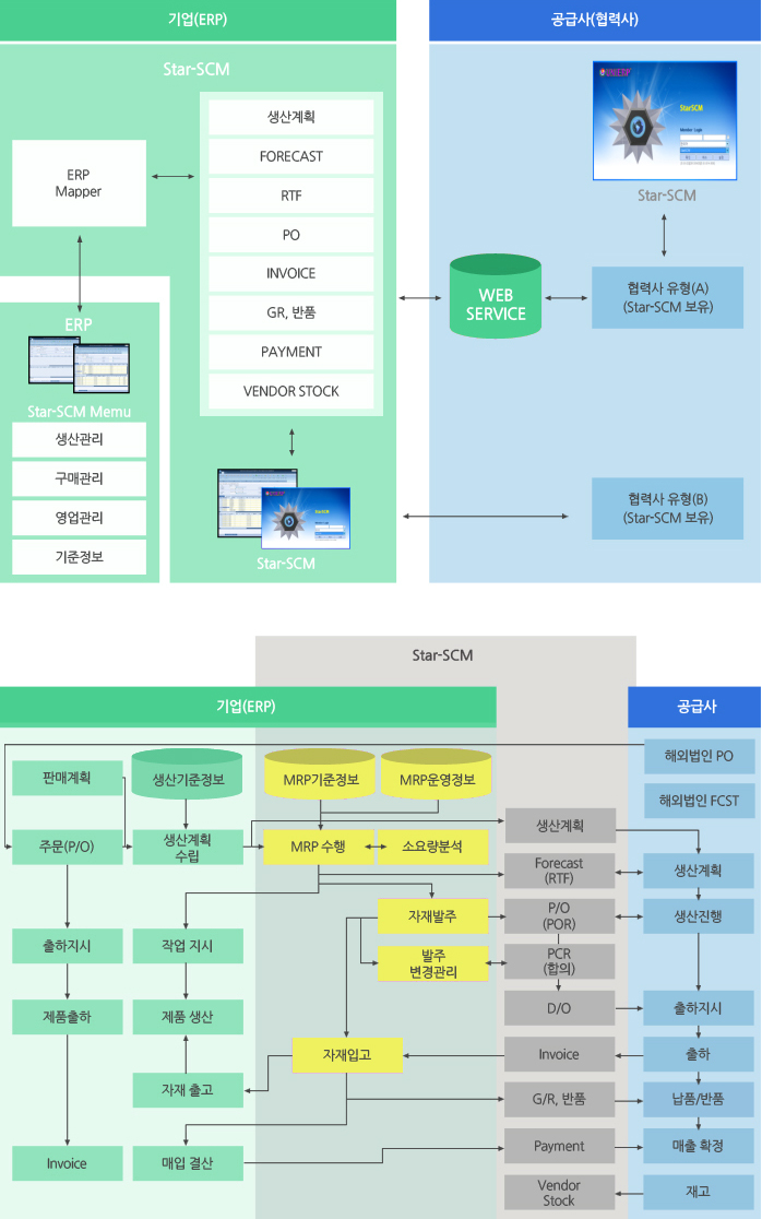 Star-SCM 솔루션은 기업과 공급사간 발주~수주~생산~재고~납품정보의 신속, 정확한 소통을 통해 기업의 자재품절, 작업대기, 불필요한 과잉생산, 오(誤) 입고 등 유실(遺失)요소를 관리함으로써 상호 정시, 정량의 납품 프로세스를 완성하는 SCM 환경을 지원 합니다.